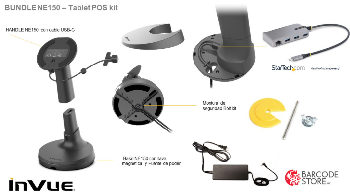 El CTBA004O38 es el Bolt Mount Kit (kit de montaje con perno) opcional diseñado por InVue Security Products para los soportes de tablet y dispositivos de las series CT80, CT150 y NE150. Este kit permite fijar de forma permanente y segura el soporte sobre una superficie rígida mediante un perno que atraviesa el mueble, mostrador o base donde se instala, ofreciendo mayor estabilidad que el montaje con adhesivo o bases antideslizantes.